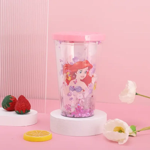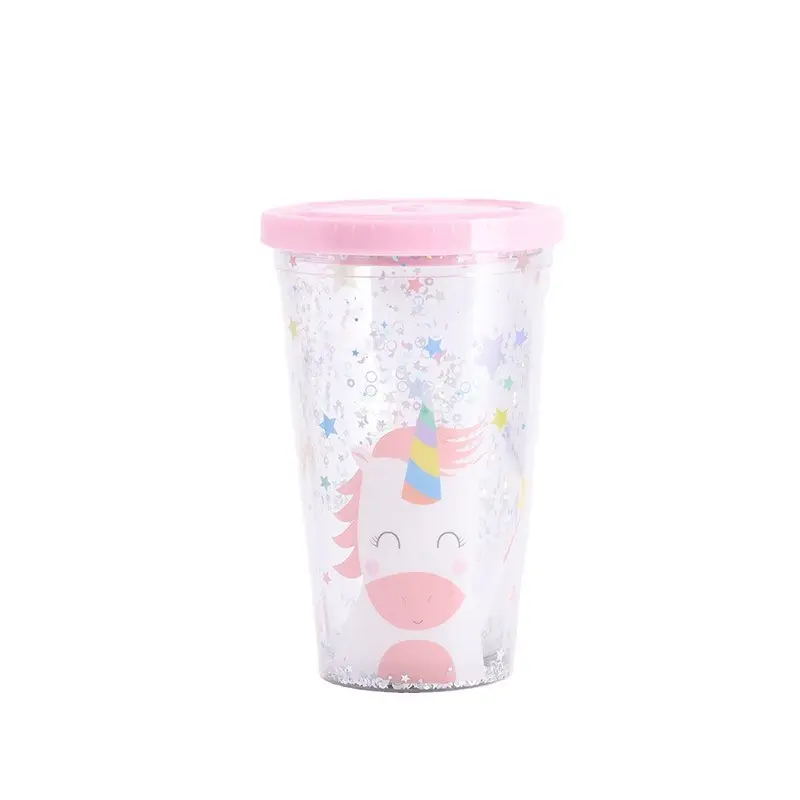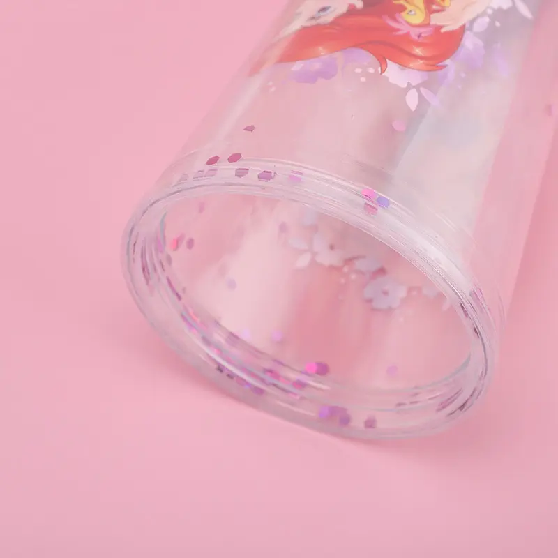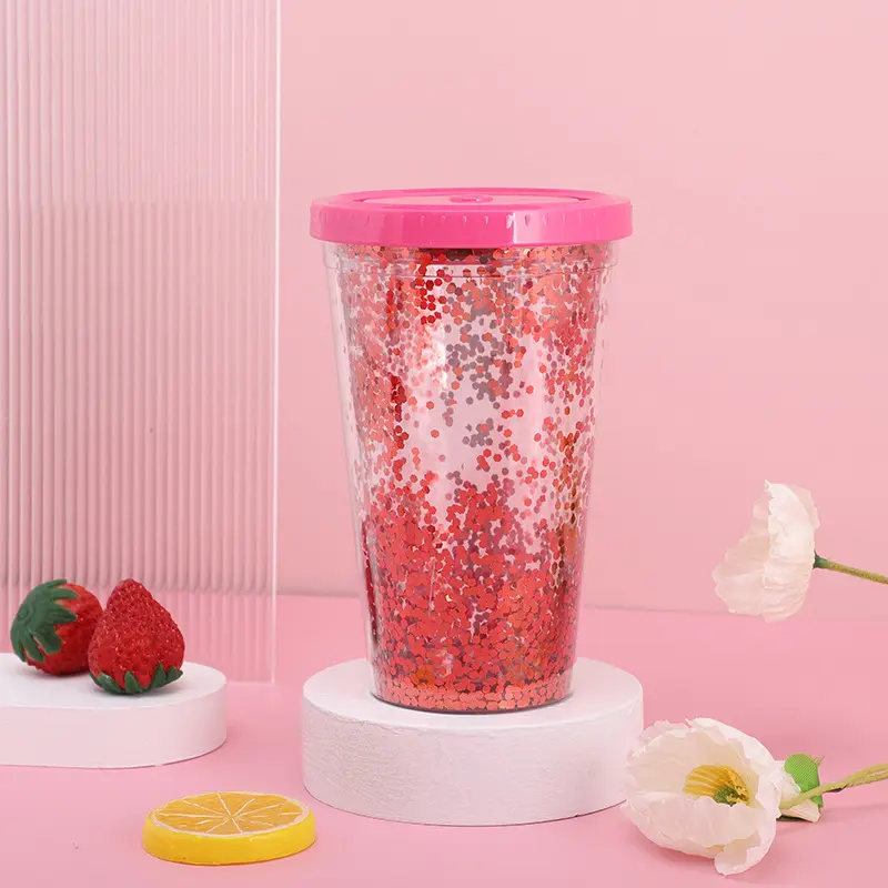 Glitter Sequins Plastic Cup, Summer Cold Drink/Juice/Coffee Cup, Clear Double - Layer with Flat Lid & Straw, Wholesale